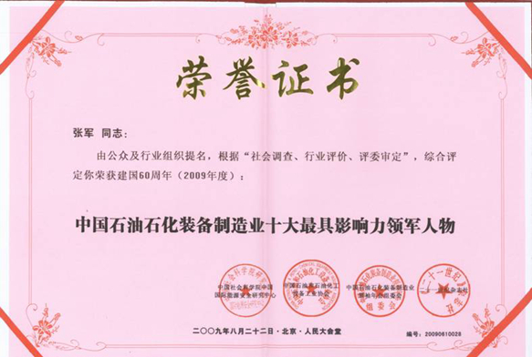 董事長張軍榮獲“2009中國石油石化裝備制造業十大最具影響力領軍人物”